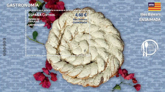 De Spaanse post startte onlangs met een nieuwe serie postzegels. Daarbij gaat het om het thema eten. De titel luidt Gastronomía: España en 19 platos. Van iedere Spaanse regio wordt een typisch gerecht voorgesteld. Voor de Balearen werd een ensaimada op een postzegel afgebeeld.