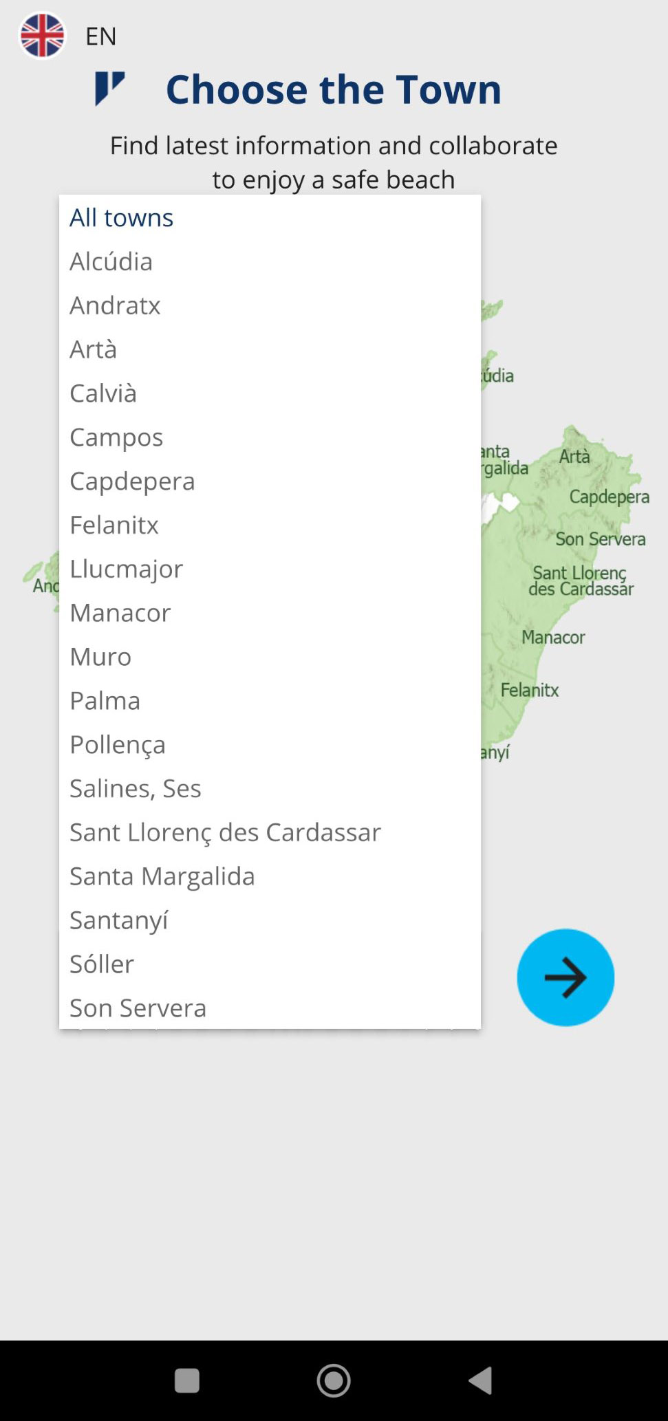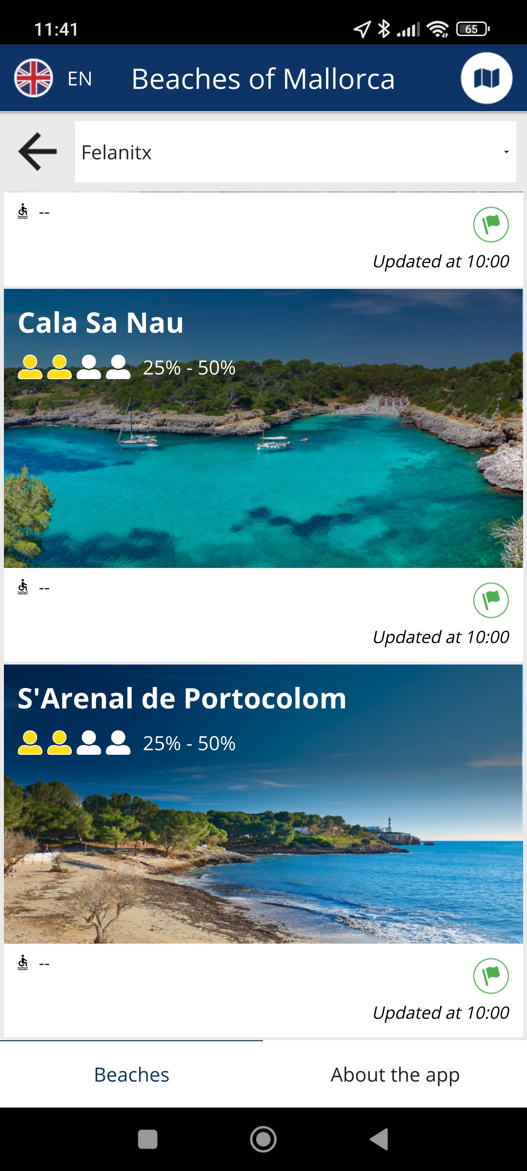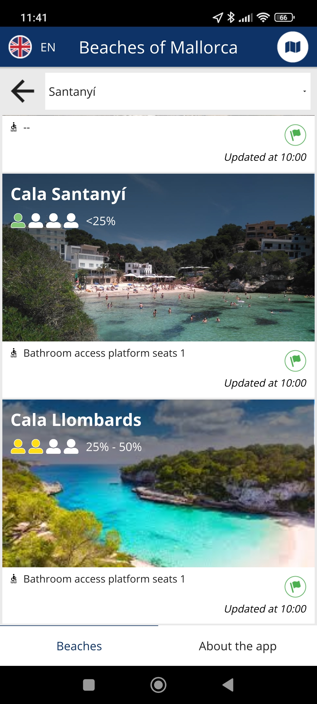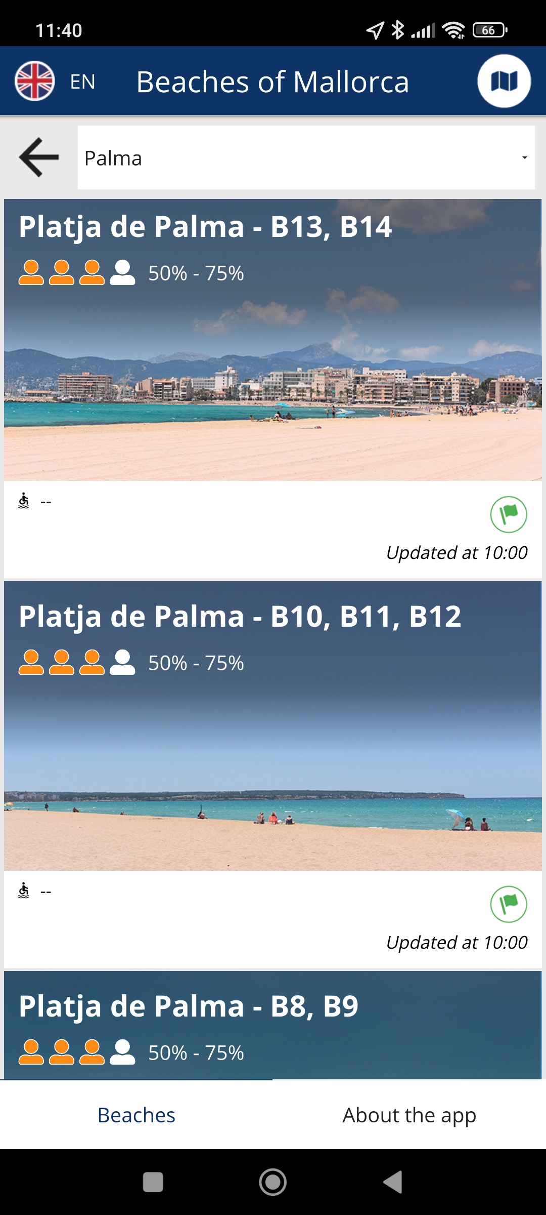 Het gebruik is gemakkelijk. Linksboven kies je de taal, daarna klik je bijvoorbeeld op “All towns” en de lijst met gemeentes verschijnt. Klik je nu op Palma, dan zie je dat het strand van Cala Major momenteel 50-75% bezet is, net als Can Pere Antonio en Platja de Palma. Links onderaan staat of er toiletten zijn, rechts onderaan welke vlag er wappert.